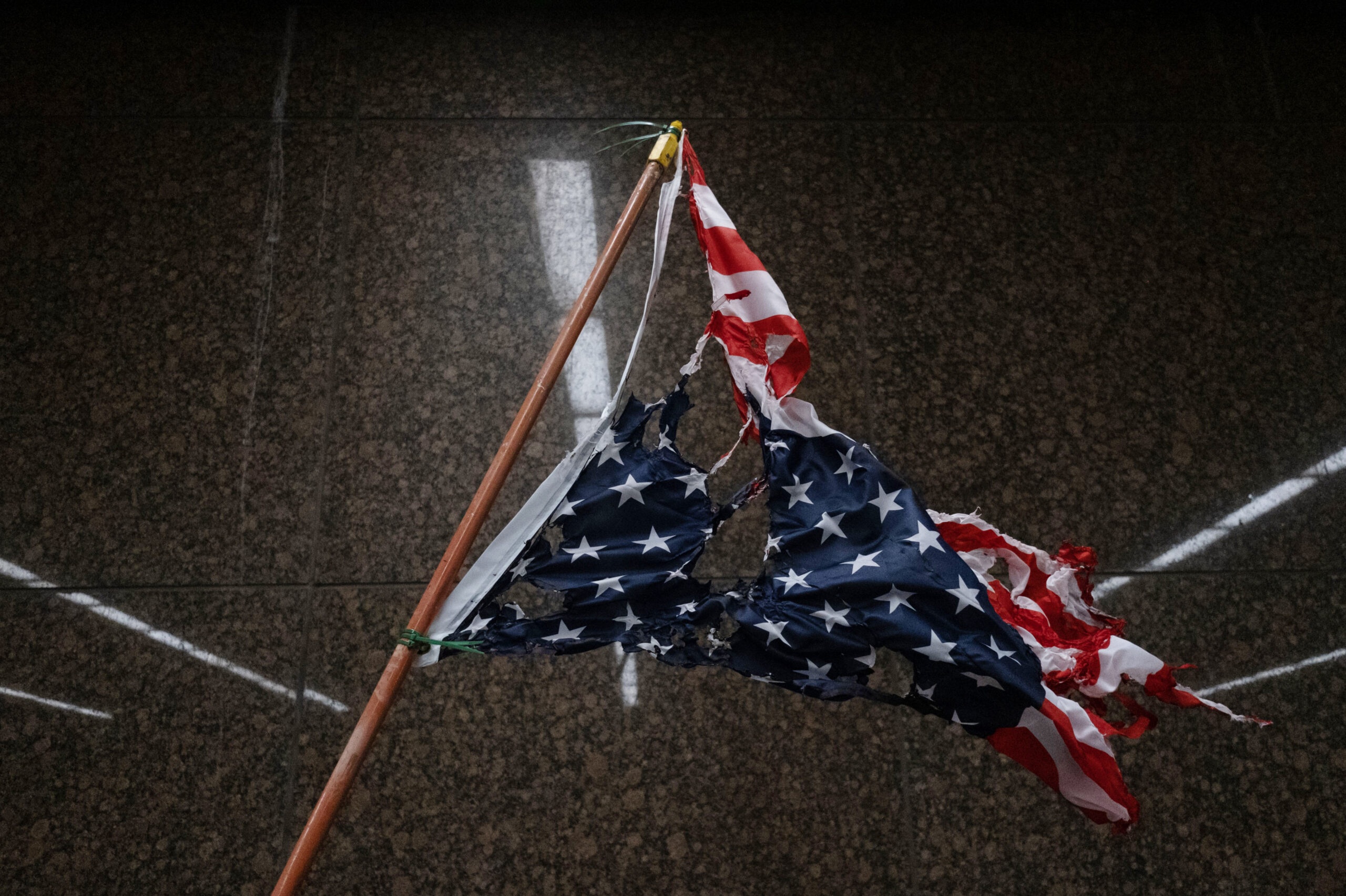 A torn and burnt upside down American flag hangs, as protesters march through the streets of Detroit, Michigan for a second night May 30,2020, protesting the killing of George Floyd who was killed by a white officer who held his knee on his neck for several minutes during an arrest in Minneapolis on Monday. AFP via Getty Images